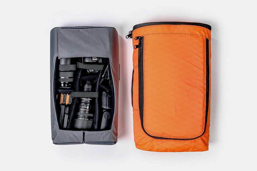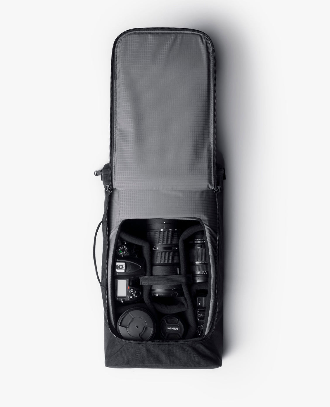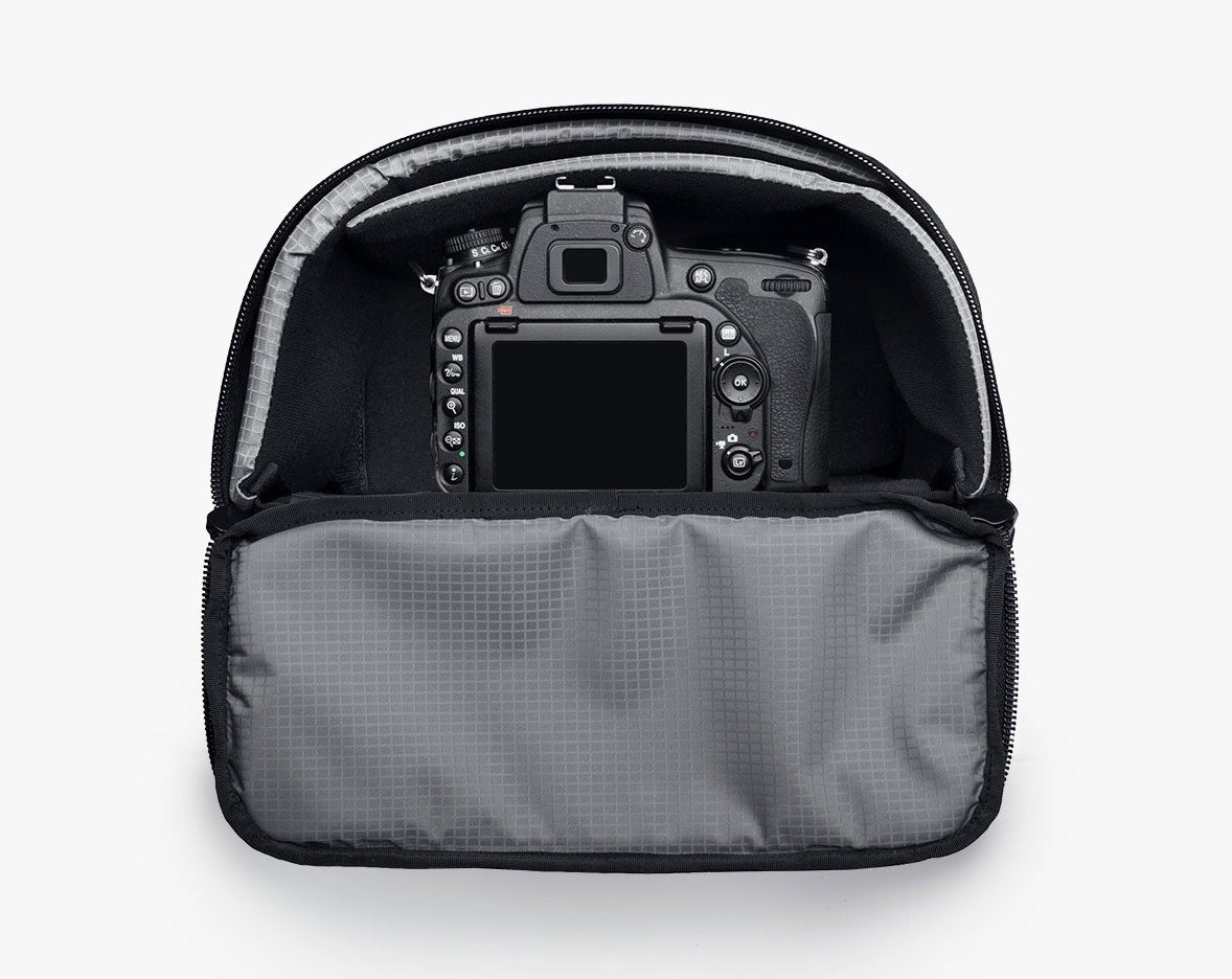 Se puede acceder al equipo del interior de la cápsula desde el panel superior o el frontal. La sección superior está diseñada específicamente para alojar un cuerpo DSLR o sin espejo con un objetivo de casi cualquier tamaño al que se puede acceder directamente sin tener que sacar la Capsule de la bolsa.