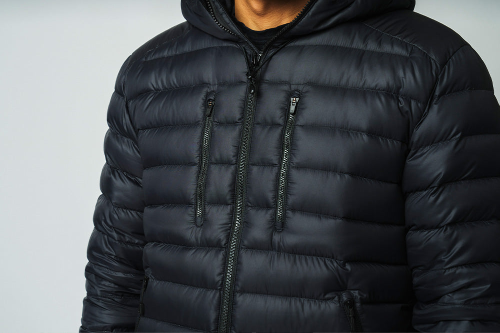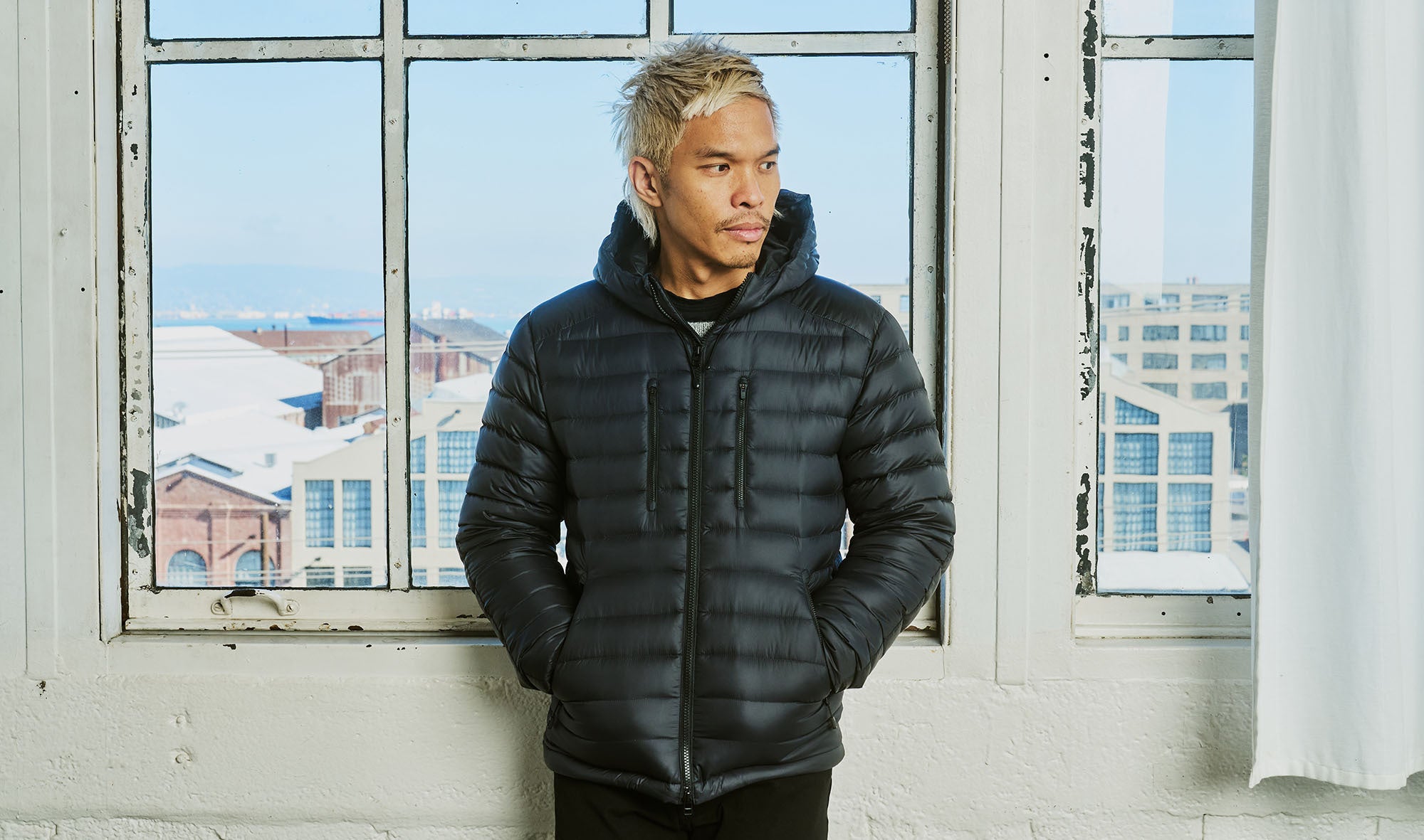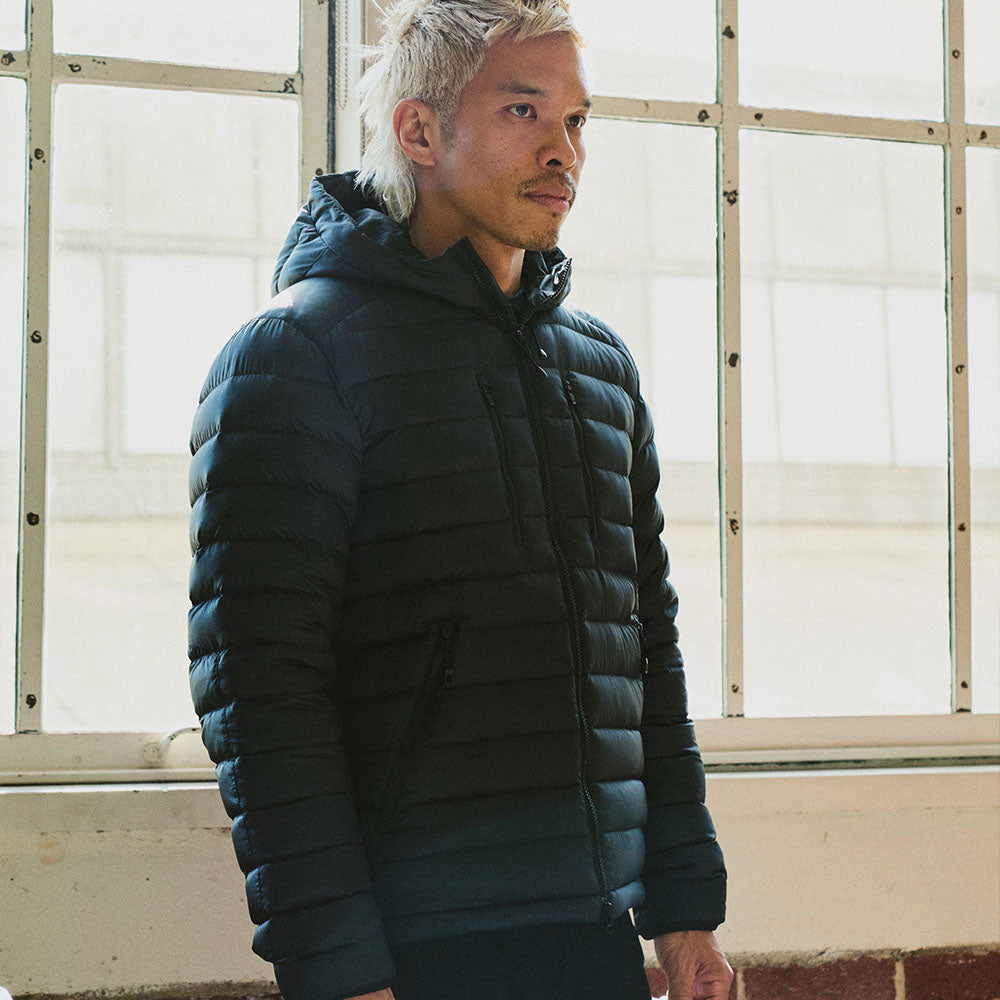 La chaqueta está confeccionada con una capa exterior de nylon 100% Pertex® mini-ripstop, homologada por BLUESIGN y acabada con un revestimiento repelente al agua, y cuenta con un aislamiento de plumón reciclado de 750 hilos del líder del sector Downlite®.