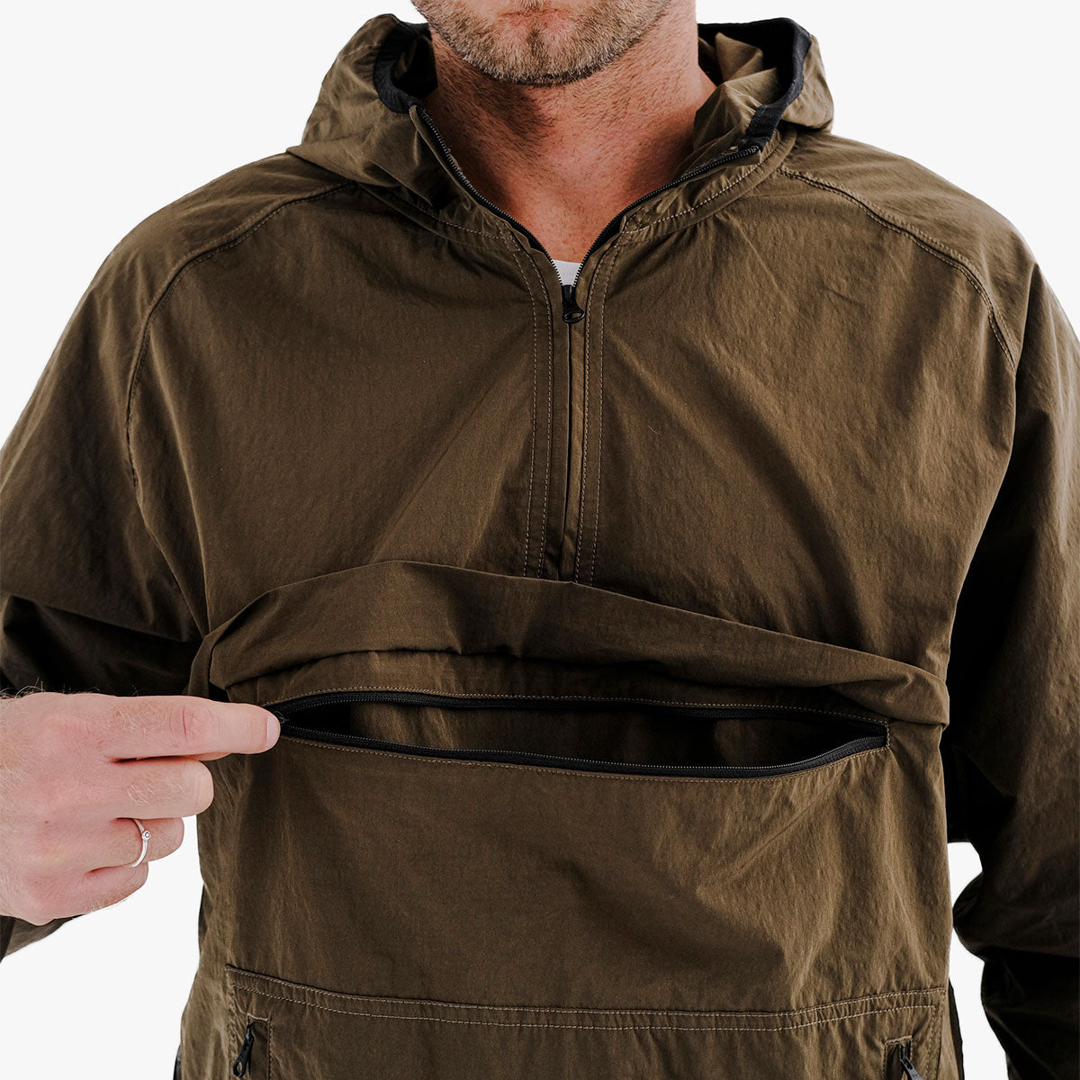 Designed to repel wind and light rain, the anorak features durable YKK zippers, a quarter chest zip, and a side ventilation zip for ease of wear and breathability.