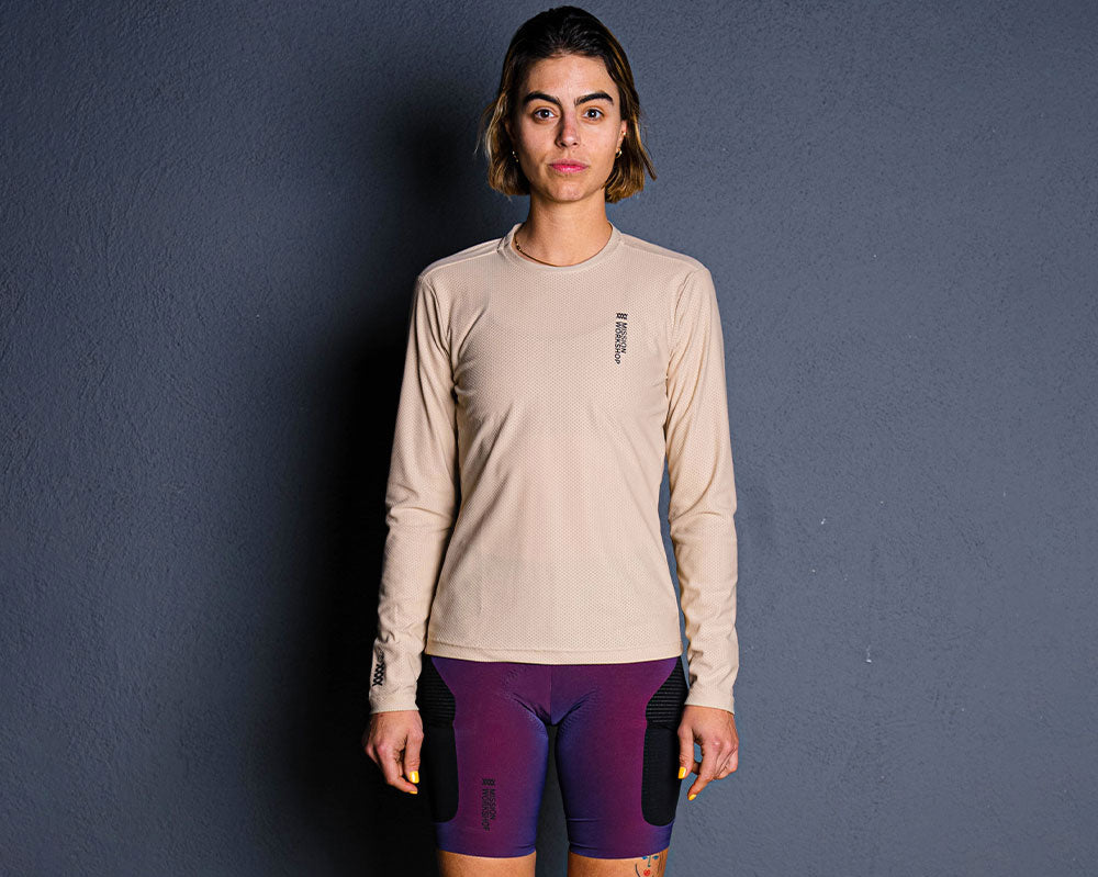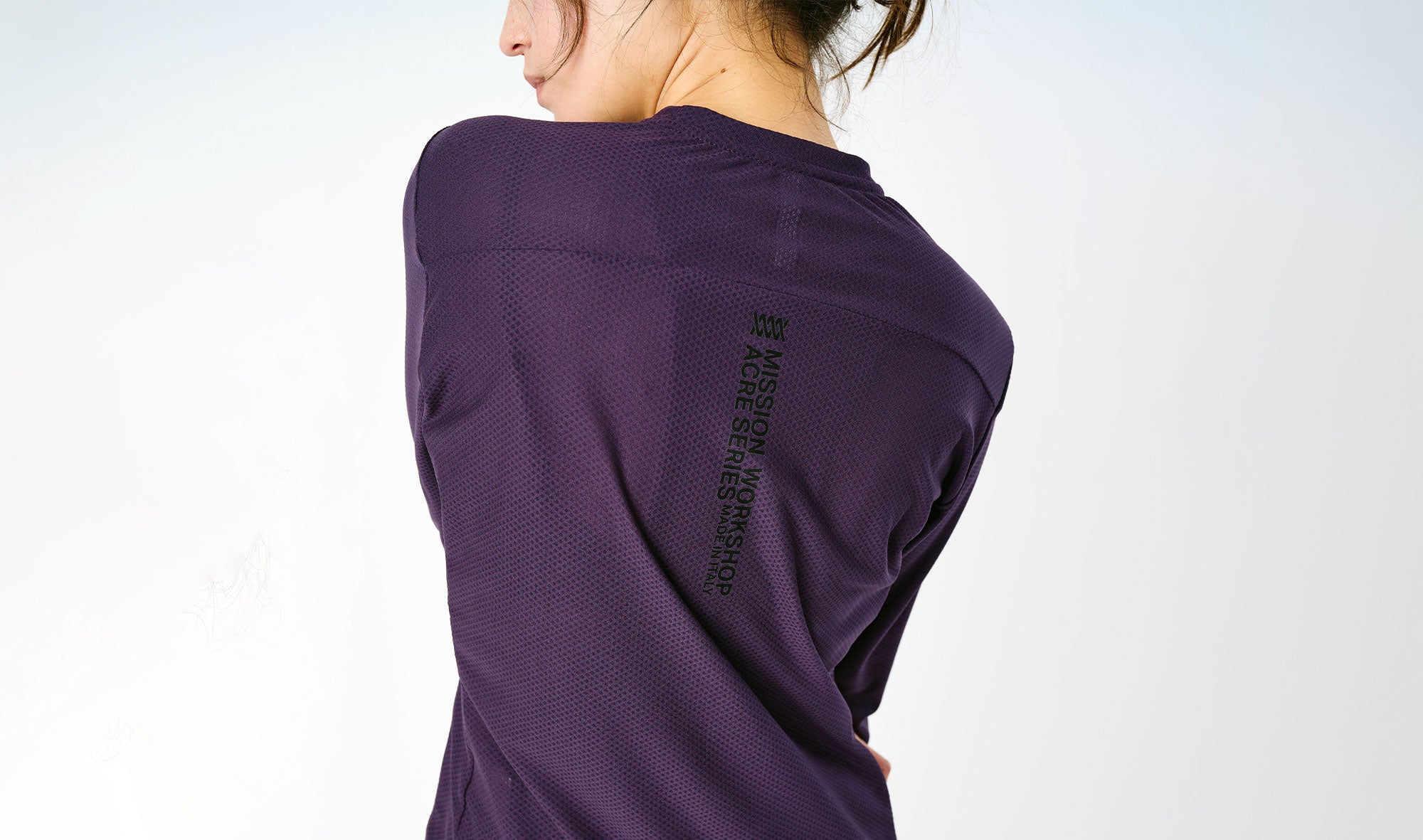 La Mission Pro Tech Tee : LS está confeccionada con una malla dimensional italiana de punto abierto que aumenta exponencialmente la superficie de transpiración y secado rápido. La transpiración mejorada se consigue mediante dos hilos diferentes que crean un diferencial que aleja la humedad del cuerpo. Funciona perfectamente como capa base, como alternativa al maillot o simplemente como camiseta de manga larga de alto rendimiento para el día a día.